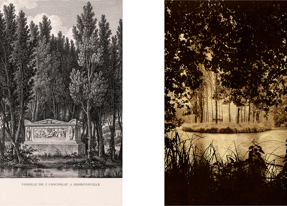 El autor de “El contrato social” pasó sus útimos días de vida invitado por su amigo y admirador el conde de Girardin en su “château”, donde había construido un extraordinaio jardín inglés al gusto del filósofo, con numerosas referencias al mundo clásico, un templete en ruinas a imitación del templo de la Sibila de Tivoli cerca de Roma y un lago artificial con la isla de los álamos donde sería inhumado en 1778. Rousseau que no quería vivir en el palacio se refugió en una cabaña de piedra cercana que él mismo construyó con sus manos, un espacio para filosofar, meditar sobre la vida, la felicidad y la naturaleza.
